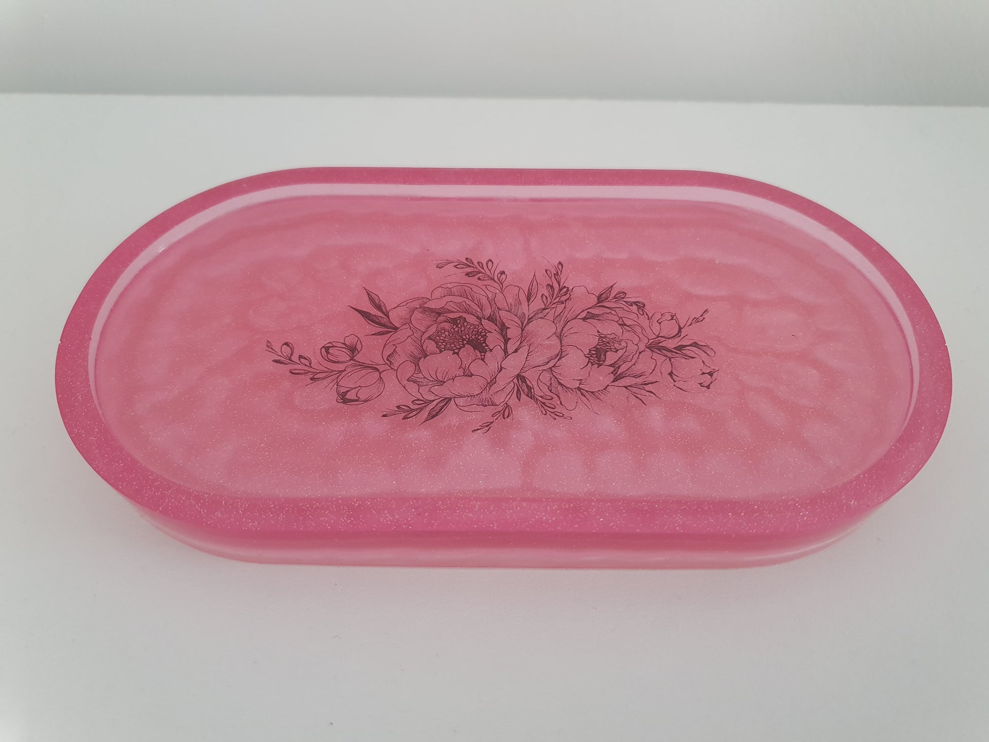 This uniquely crafted tray is composed of a pink and baby pink resin which is further ornamented with mica powder for a glittery aesthetic. Its oval form, in conjunction with its central tattoo design, make it ideal for organizing small items such as keys, scents, cosmetics, and jewelry.
